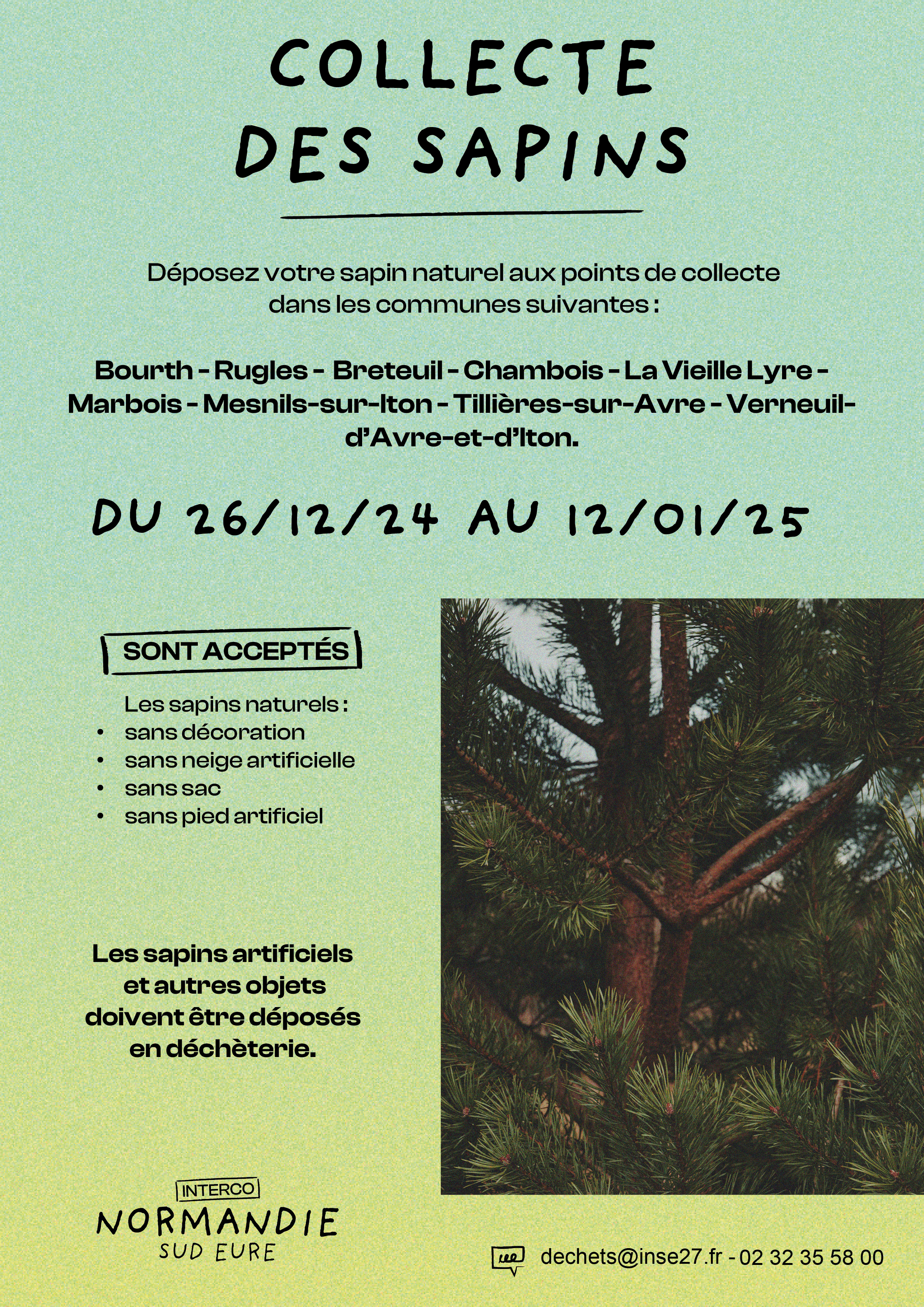 Cette année encore, l'Interco Normandie Sud Eure renouvelle son opération de collecte des sapins de Noël naturels.