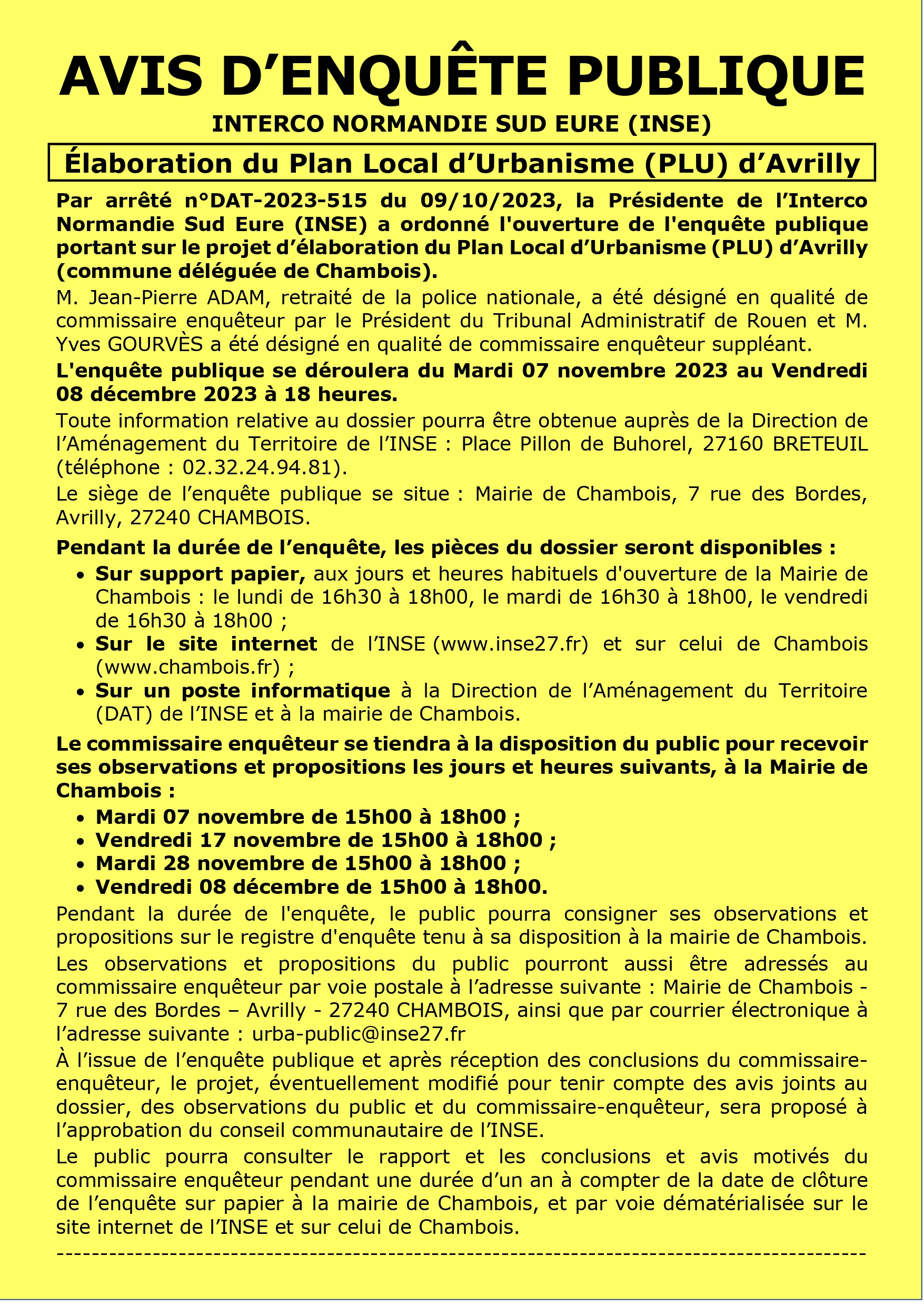 Les observations et propositions du public pourront aussi être adressés au commissaire enquêteur par voie postale à l’adresse suivante : Mairie de Chambois, 7 rue des Bordes, Avrilly, 27240 CHAMBOIS, ainsi que par courrier électronique à l’adresse suivante : urba-public@inse27.fr