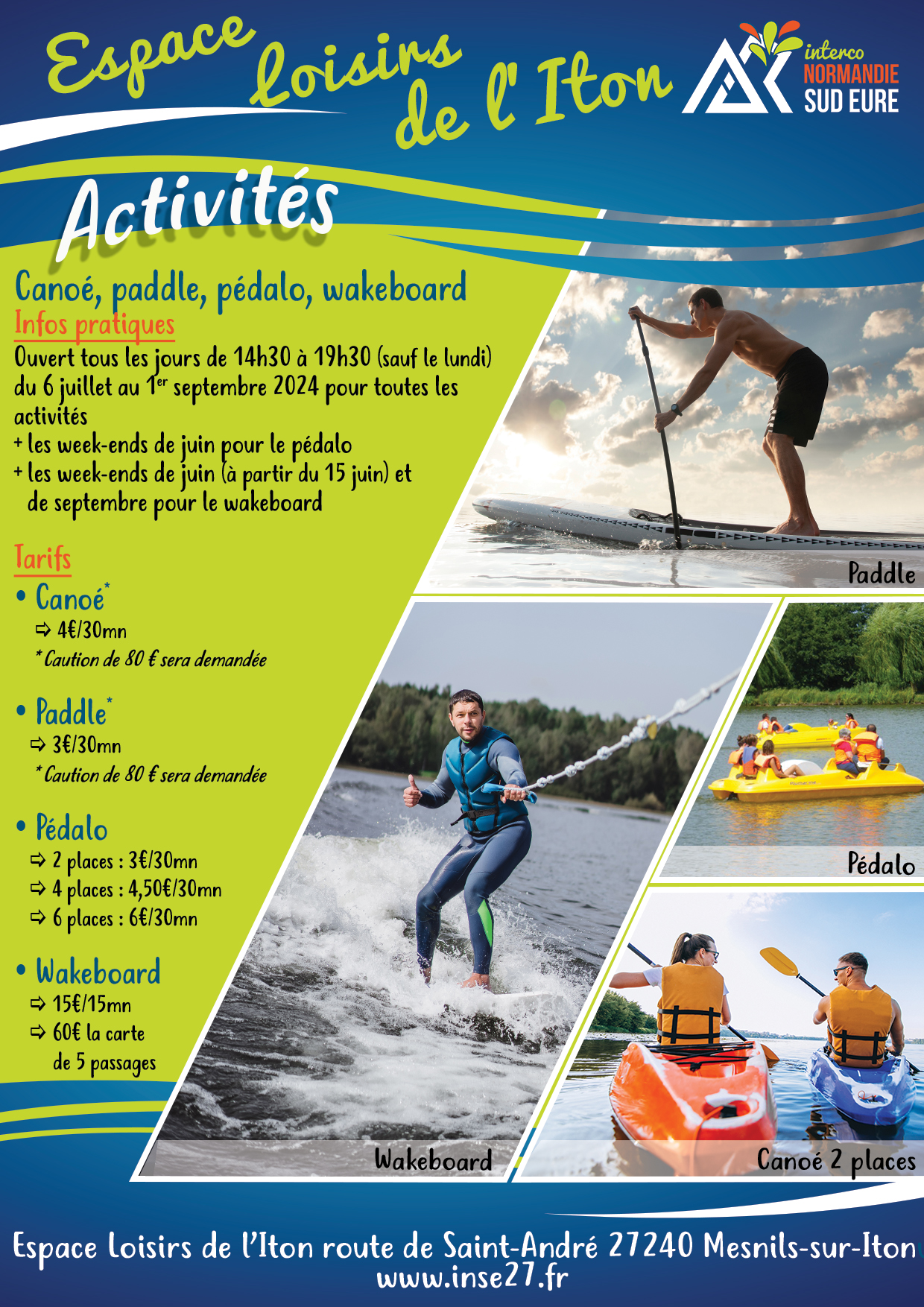 Wakeboard : tous les week-end de juin et de septembre (à partir du 15 juin) et tous les jours du 6 juillet au 1er septembre 2024 (fermé le lundi).