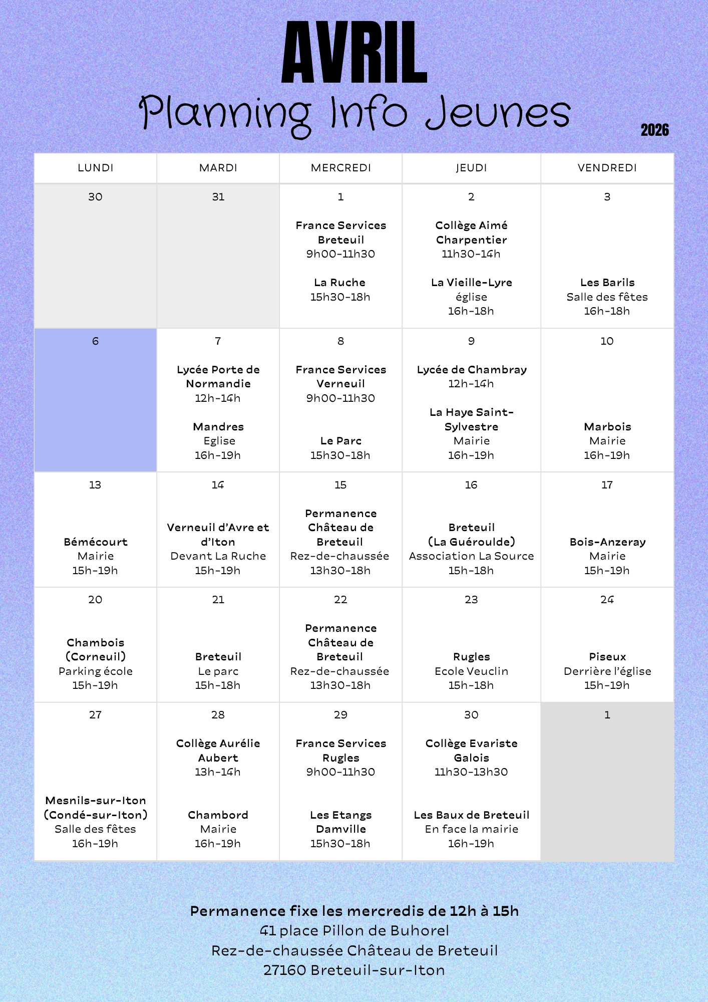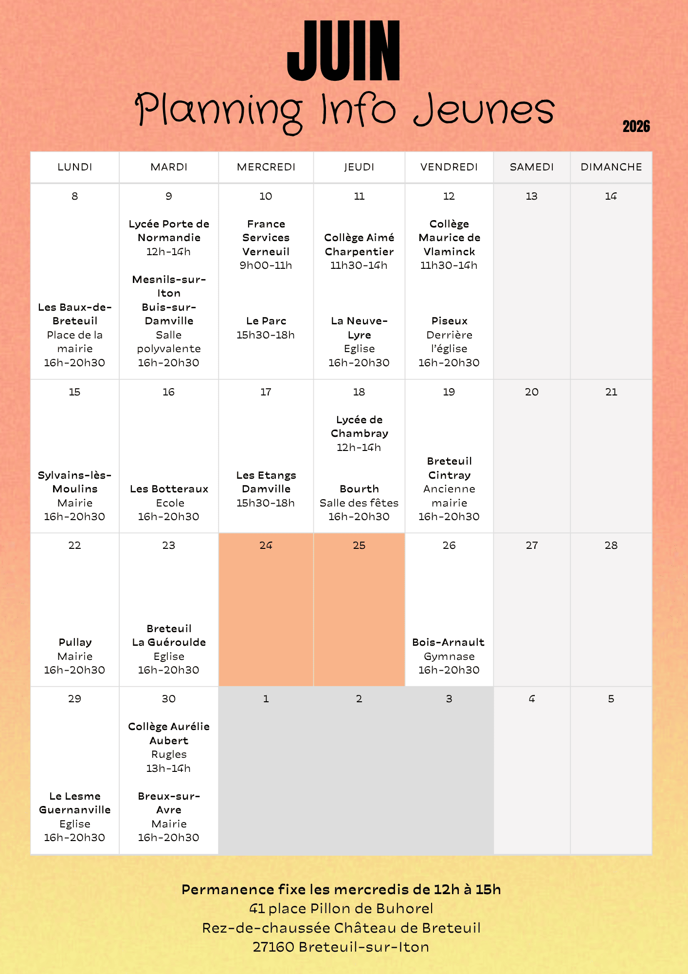 Que vous ayez besoin d’aide pour trouver un job, partir à l’étranger, comprendre vos droits, monter un projet ou simplement poser des questions sur la vie quotidienne… L’Espace Info Jeunes Normandie Sud Eure est là pour vous écouter, vous informer, vous orienter et vous accompagner. Vous avez entre 11 et 25 ans ? Venez nous rencontrer ou retrouvez-nous sur le territoire grâce à notre bus itinérant, pour un accueil sans rendez-vous, proche de chez vous.