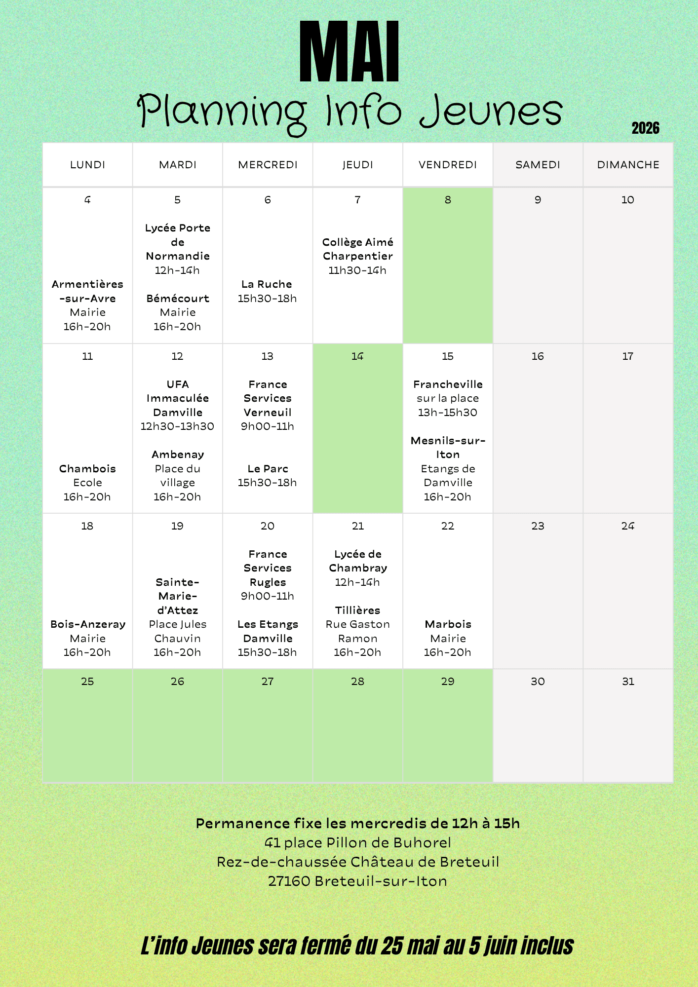 - infojeunes@inse27.fr ou 06 72 74 30 03