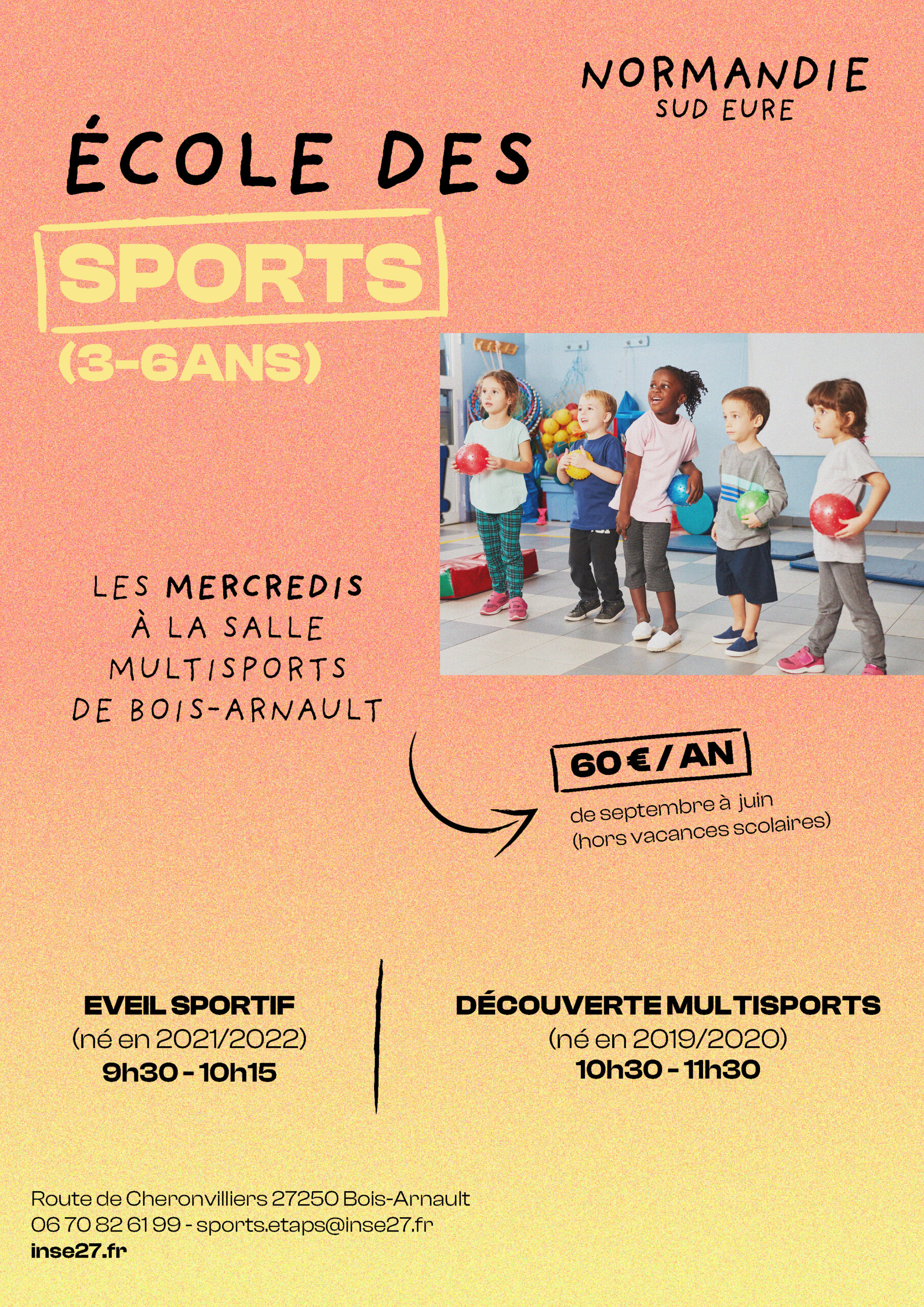 Proposer aux jeunes enfants (nés entre 2018 et 2021) une multitude d'activités sportives adaptées à leurs capacités physiques tous les mercredis à la salle multisports de Bois-Arnault.